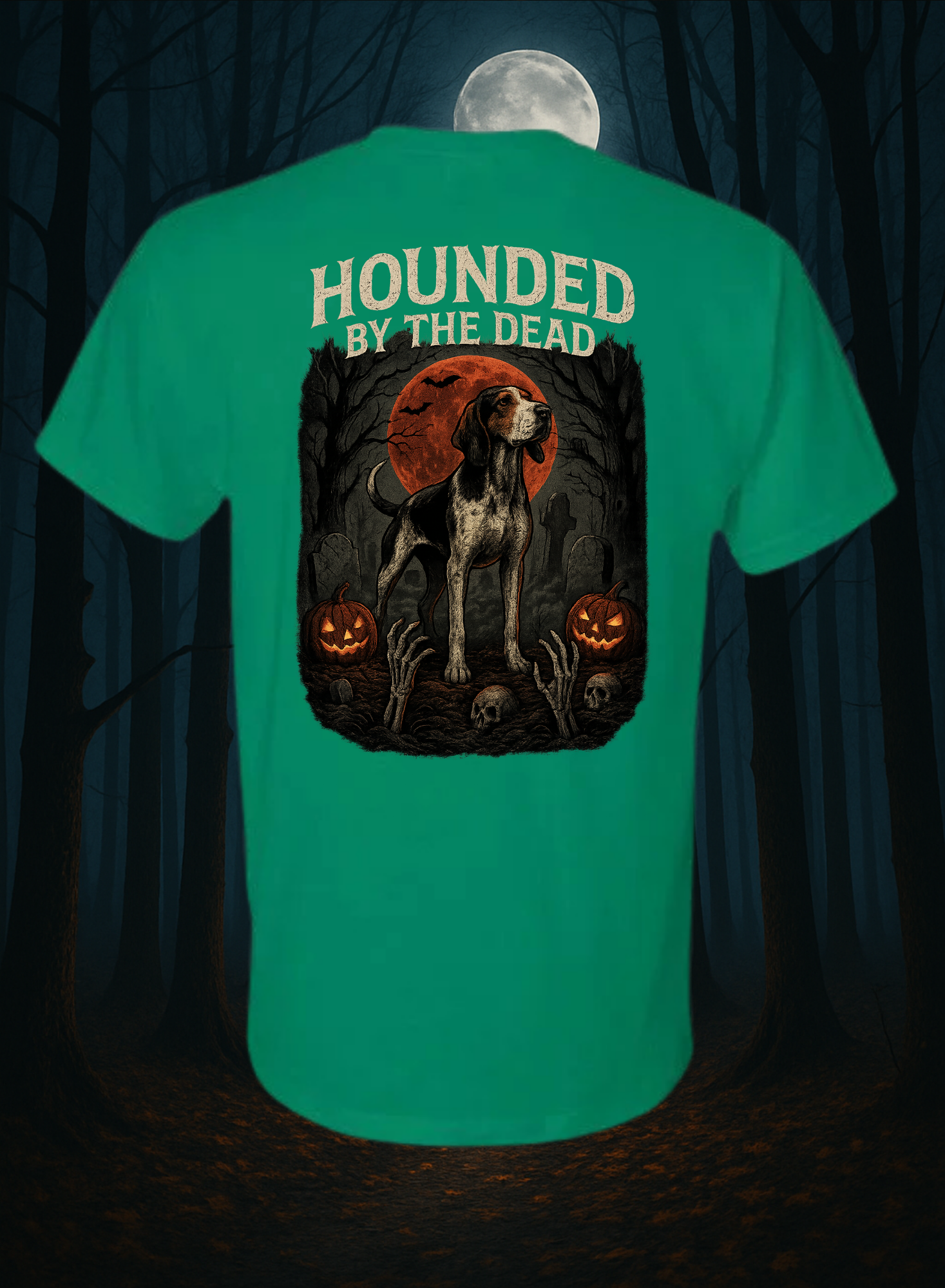 Step into the graveyard this Halloween with our brand-new Hounded by the Dead design. Featuring a fearless coonhound standing tall under a blood-red moon, surrounded by jack-oโ-lanterns, tombstones, and rising skeleton hands, this shirt perfectly blends hunting pride with spooky season chills.