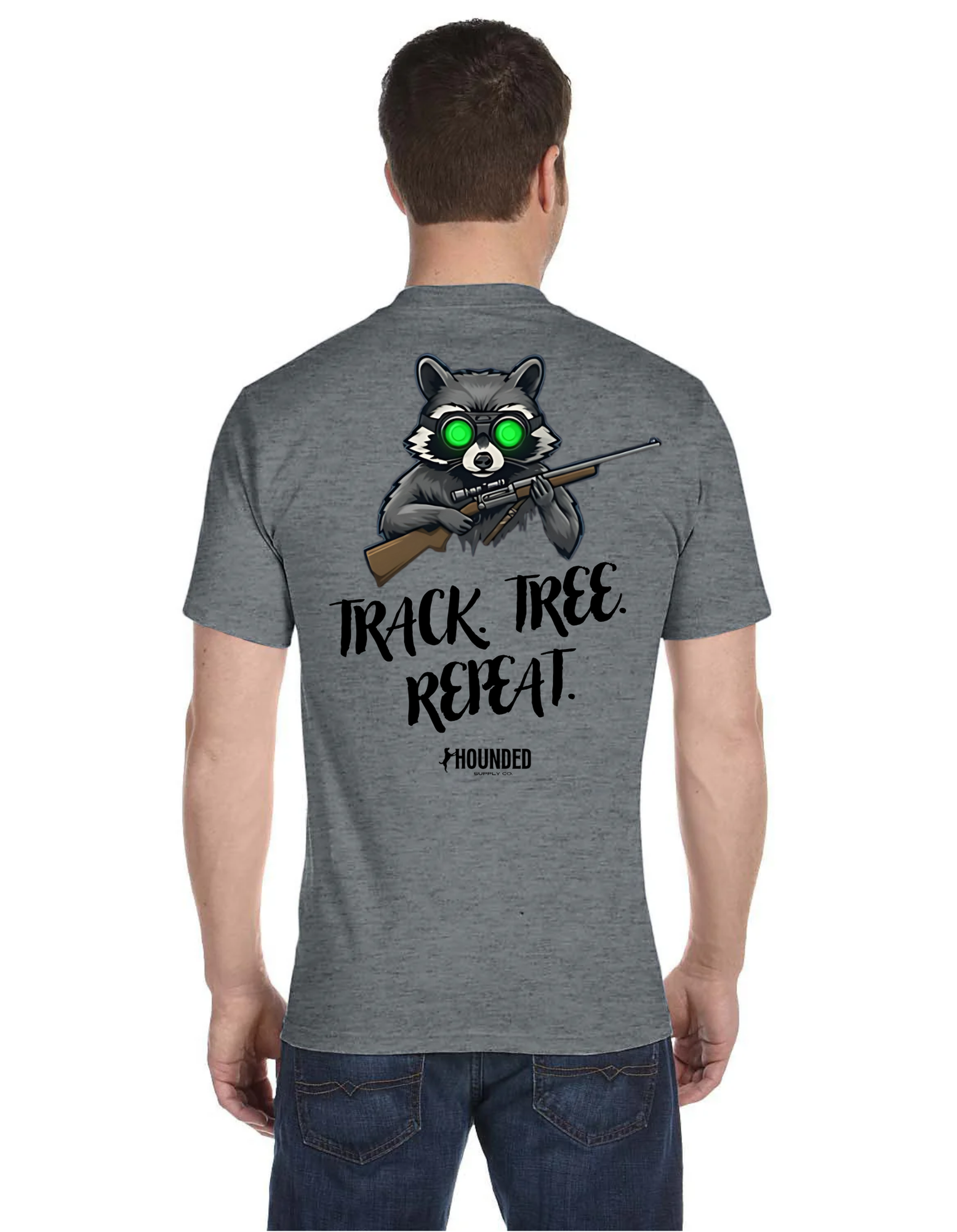 Gear up with the ultimate hound hunter’s graphic tee. Featuring a badass raccoon locked and loaded with night vision and a rifle, this shirt brings the heat (and the humor) to your huntin’ wardrobe. Bold lettering screams your motto loud and clear: Track. Tree. Repeat. Finished off with the Hounded Supply Co. stamp of authenticity, this shirt is built for those who live for the chase.