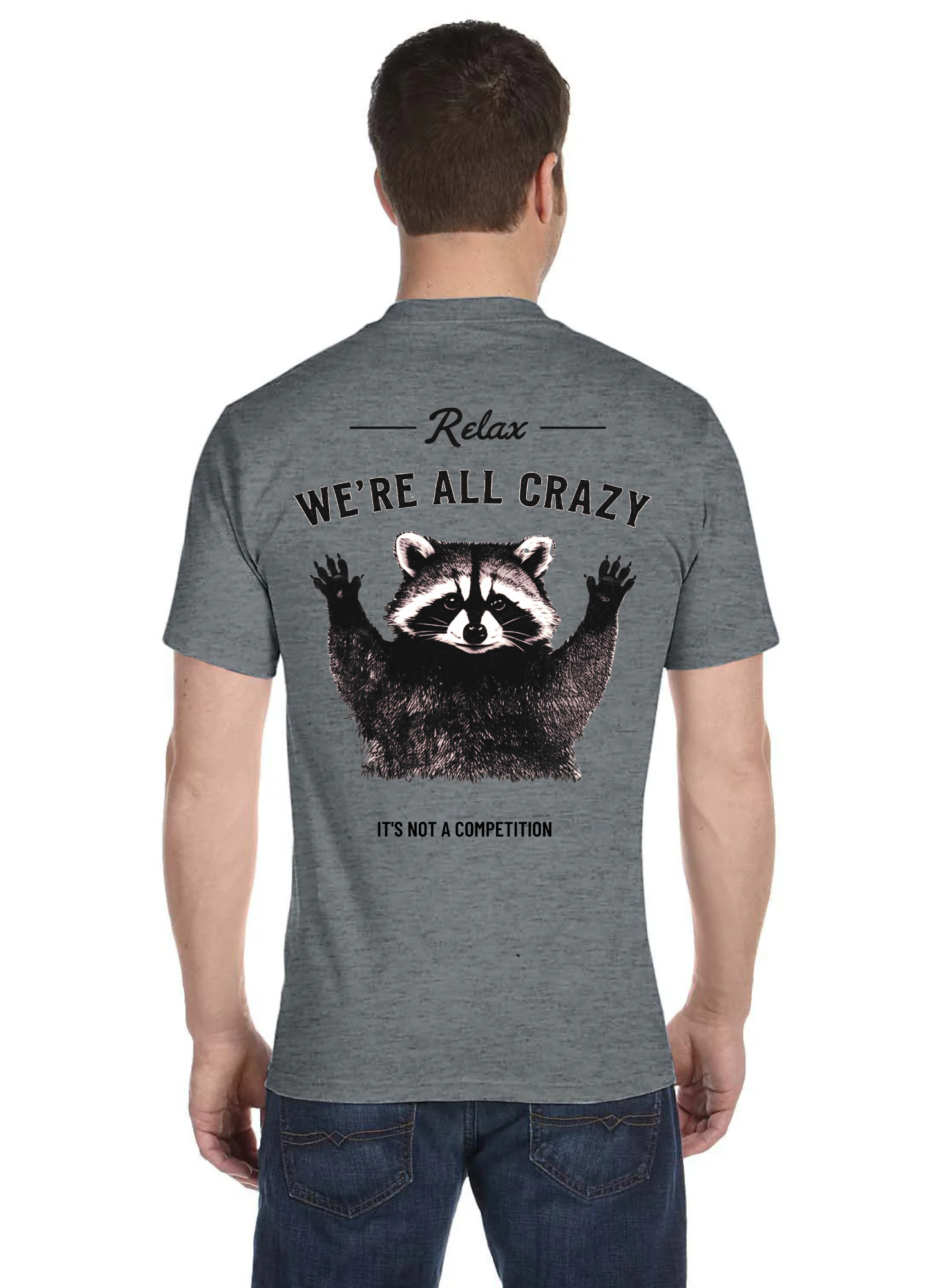 Let the world know you're embracing the chaos — with a little humor and a whole lot of personality. This tee features a wide-eyed raccoon throwing up the universal “I give up” hands, paired with the line: “Relax. We’re All Crazy. It’s Not a Competition.” It’s the perfect mix of sarcasm, relatability, and wild raccoon energy.